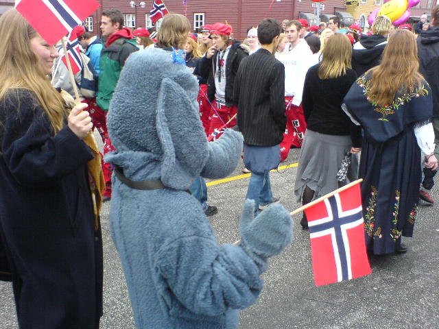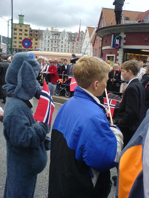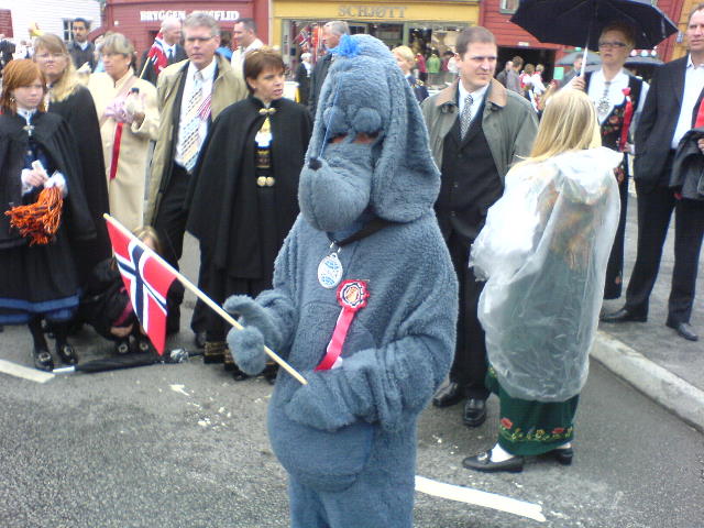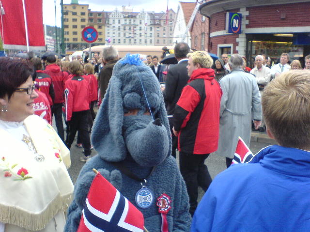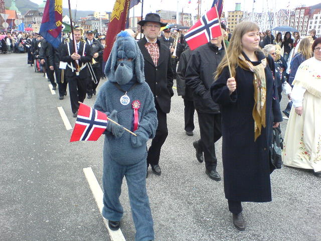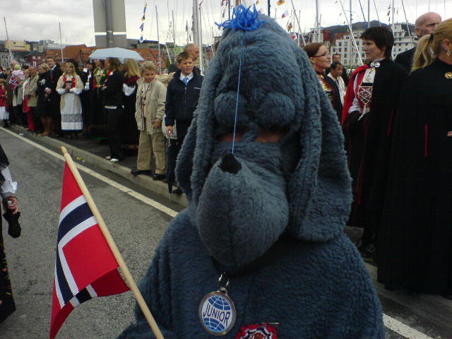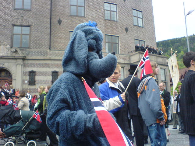 …For andre gang deltok Junior i hovedprosesjonen i Bergen 17. mai. Underveis vanket det smil og muntre tilrop fra ungene langs ruten. Men han var bare sånn passe fornøyd med å bli kalt en blå elefant…